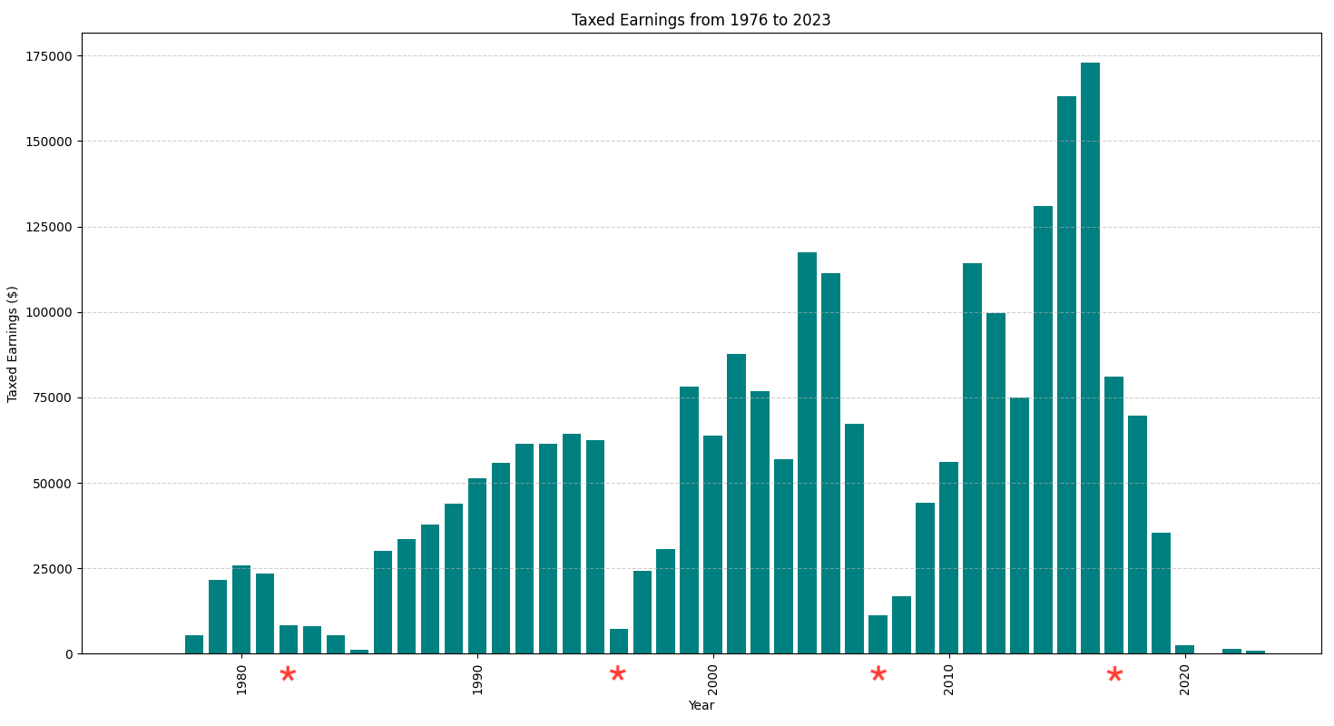 Year Taxed Earnings 1976 0 1977 0 Moved back to California from east coast. 1978 5,298 1979 21,538 Work at Amdahl 1980 25,900 1981 23,393 At UCSC for 2nd B.A. for 3 years. 1982 8,391 Summer job at Amdahl 1983 8,113 1984 5,460 Traveling for 9 months. 1985 1,153 Traveling 1986 30,000 Santa Cruz Operation (SCO) 1987 33,434 1988 37,857 1989 43,769 1990 51,300 1991 55,830 1992 61,338 1993 61,315 1994 64,381 1995 62,386 1996 7,218 Laid off, began living at MMC 1997 24,260 Back to house in Santa Cruz 1998 30,644 1999 78,105 Brother and Father died. 2000 63,900 2001 87,606 2002 76,704 2003 56,853 2004 117,356 2005 111,385 Fired by Yahoo 2006 67,283 2007 11,272 Began rewrite of Reg 2008 16,708 Sister died. 2009 44,043 Went live with Reg 2010 56,203 2011 114,391 Moved to Redwood City 2012 99,666 2013 74,956 2014 130,977 2015 163,197 2016 172,998 2017 81,137 Retired but still consulting 2018 69,695 2019 35,489 2020 2,360 2021 0 2022 1,487 2023 976